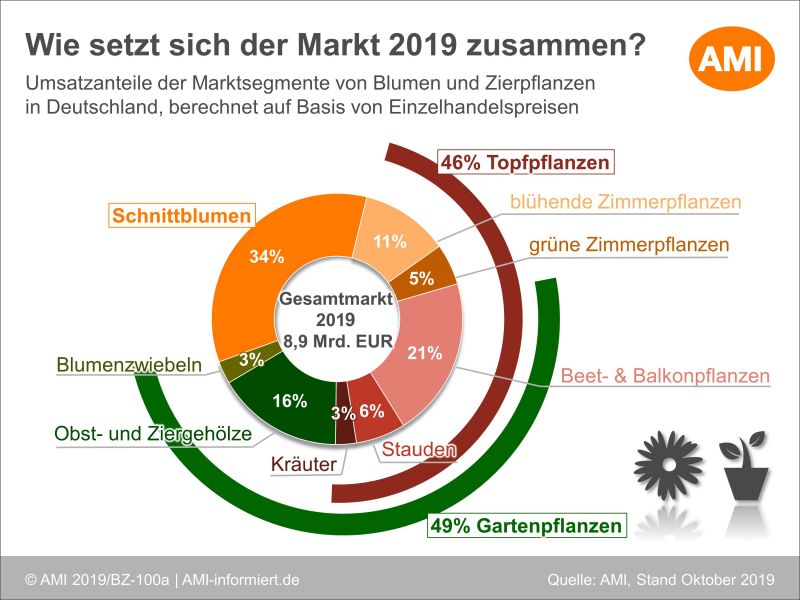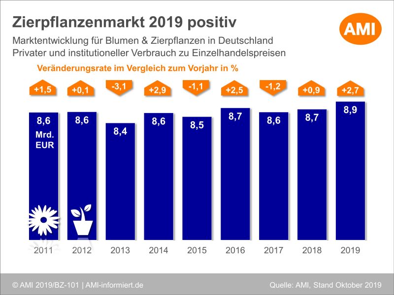 Nach Schätzungen und Hochrechnungen der Agrarmarkt Informations-Gesellschaft (AMI) im Auftrag des ZVG auf Basis der ersten neun Monate stieg der Gesamtumsatz mit Blumen und Zierpflanzen zu Einzelhandelspreisen 2019 erfreulicherweise um 2,9 Prozent auf 8,9 Mrd. Euro. Das ist das größte je gemessene Marktvolumen von Blumen und Pflanzen in Deutschland. Entsprechend sind auch die Pro-Kopf-Ausgaben je Verbraucher von 105 Euro auf 108 Euro gestiegen.