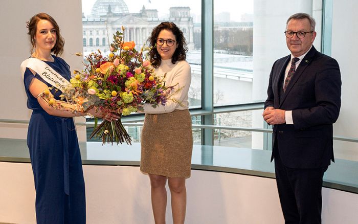 ZVG-Präsident Jürgen Mertz und die amtierende Deutsche Blumenfee 2021/22 Johanna Griem brachten florale Valentinsgrüße des deutschen Gartenbaus ins Kanzleramt, Staatsministerin Sarah Ryglewski nahm sie entgegen.