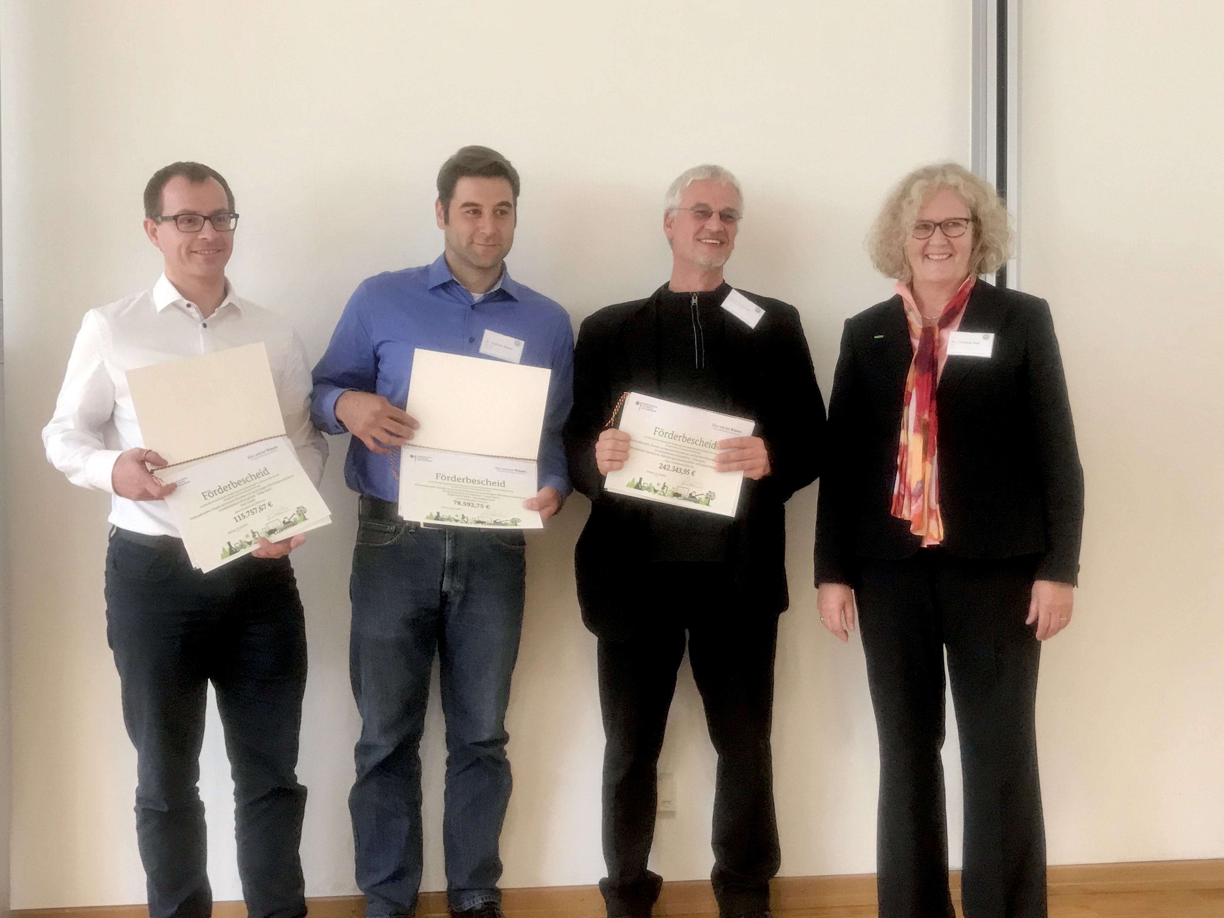 Dr. Christine Natt überreicht die Zuwendungsbescheide für das Projekt "Flying Data – Einsatz autonomer Drohnen zur nachhaltigen Pflanzenproduktion in Gewächshäusern".
